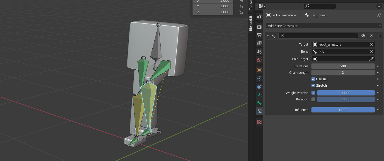 - Go to Pose Mode, select FIRST the IK bone, then the leg bone