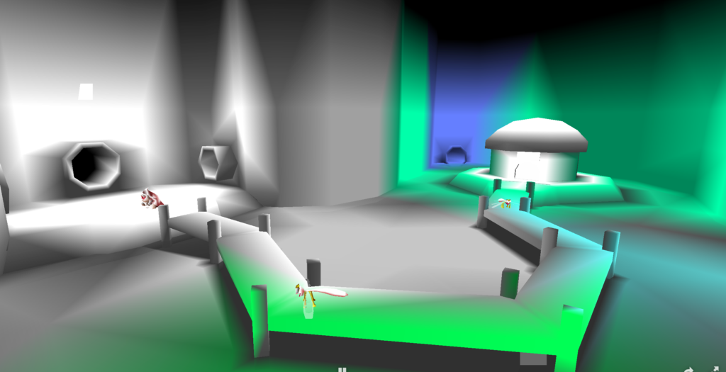 An inspection of the vertex colors reveals the grass color and the yellow path, as well faked lights, shadows and ambient occlusion (again, thanks to noclip.website):