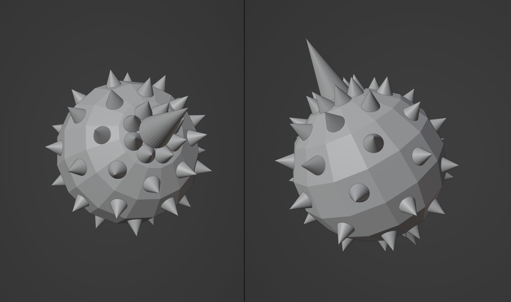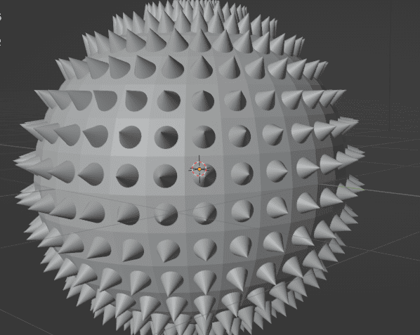 - I wanted to create a UV Sphere with spikes (cones), where spikes are aligned to the UV Sphere’s faces normals. I want the spikes to be alternated/ping-ponged: one spike, an empty spot, so on and so forth.