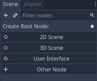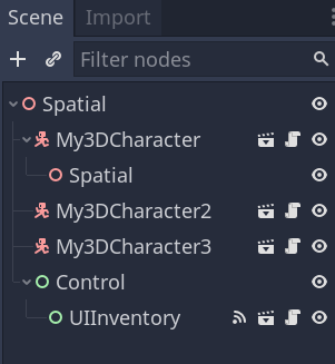 In a new Scene Node Tree, you can add many different Scenes as Nodes and also add new standalone Nodes (remember that whenever a Node has a clapperboard icon, it’s an instanced Scene).