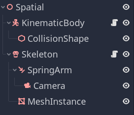 For that reason, for our Third Person Character example, we can arrange it with a Node of the type KinematicBody as the root and as a child all the other Nodes (or “Components”):