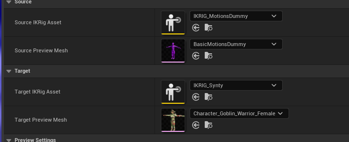 The most important settings are the “Source” and “Target” assets. In this case, the animations come from BasicMotions, so its IKRig is the source. Then, I want to animate the Synty characters with those animations, so I set it as the target: