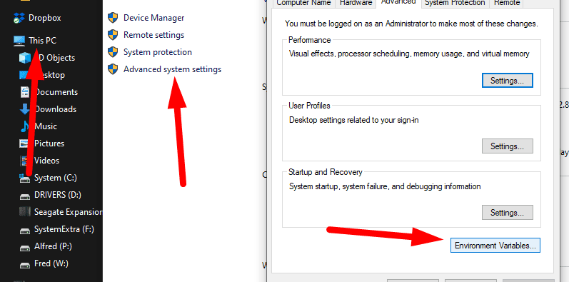 In Windows, right-click "This PC" (or "My PC"), go to Properties and choose Advanced system settings, then click Environment Variables.