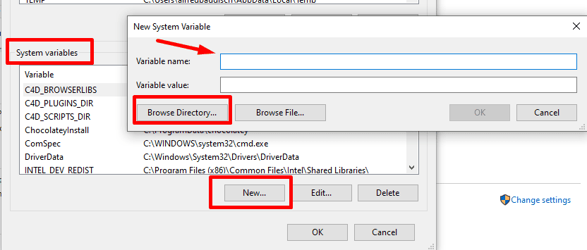 In "System variables", click "New…" and in "Variable name" put one of the 3 values below. For the "Variable value" click "Browse Directory…" and go to the directory related to the variable name. Repeat this step three types, one for each of variable names below.
