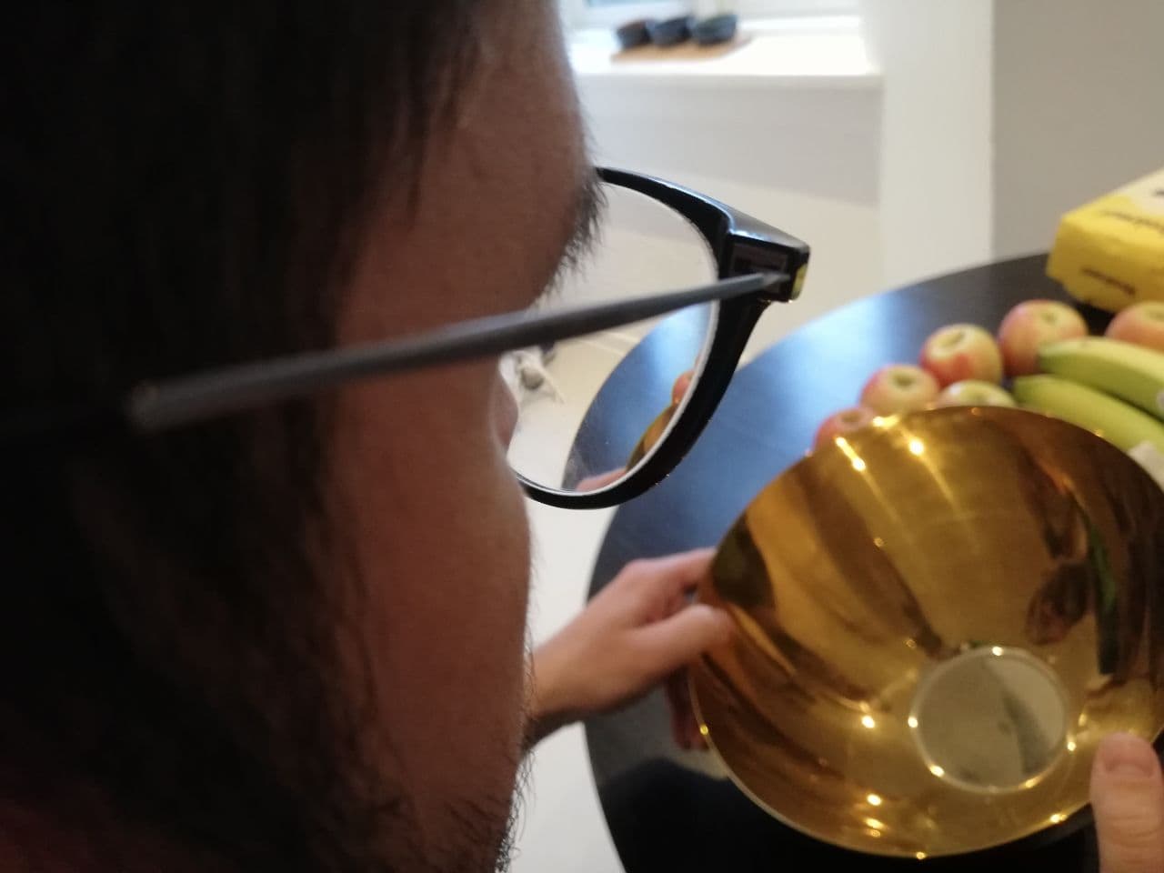 So, today I got really surprised when I noticed in a kitchen bowl, how my own reflection would appear mirrored down up to the middle point of the bowl and from the middle point to the bottom, I would appear mirrored without distortion.