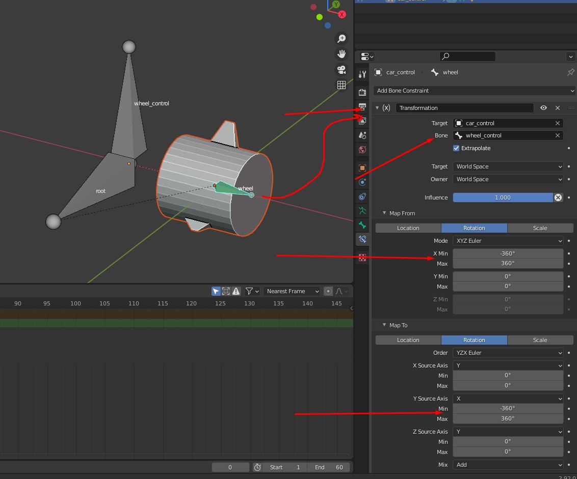 After a lot of thinkering, I learned and managed a way to rotate a bone (for example, for a wheel), using another bone as the controller, by adding a Transformation constraint, which I've never used before. TL;DR; Blender Transformative constraint in a bone / armature to rotate/spin wheels.