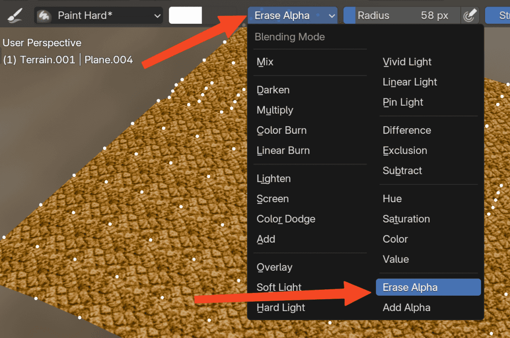 Then go to the Brush's blending mode settings and choose either Erase Alpha or Add Alpha, and this is how you can affect the vertex color alpha in Blender.