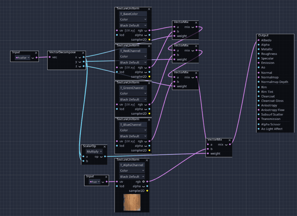 - In the material, you interpolate between the different textures with the main texture of the mesh, where the amount/alpha are the vertex colors.