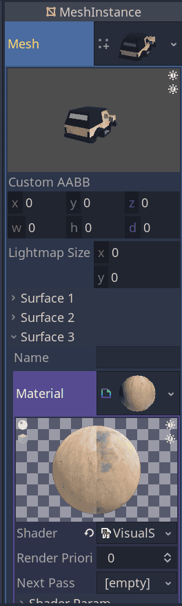In this case, MeshInstance's "Surface 3" contains the material R_M_SuvHood.tres and "Surface 5" contains the material R_M_SuvWindows.tres.