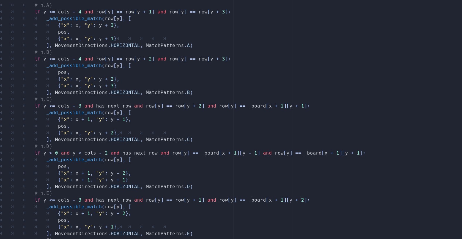 ExperimentsGamedev152: Match-3 Game with GodotJournal Initial GDScript code and Matching Patterns January 2, 2022 Updated: January 2, 2022 Specified how to match all possible combinations in a match-3 board and then came up with 16 possible matching patterns (8 horizontal matches and 8 vertical matches). Implemented the matching patterns with GDScript in a fresh Godot project. All Logs from 152: Match-3 Game with Godot Initial GDScript code and Matching Patterns January 2, 2022 Brainstorming Programming Specification ← Previous post 151: Restarting Digital Painting Next post → 152: Match-3 Game with Godot