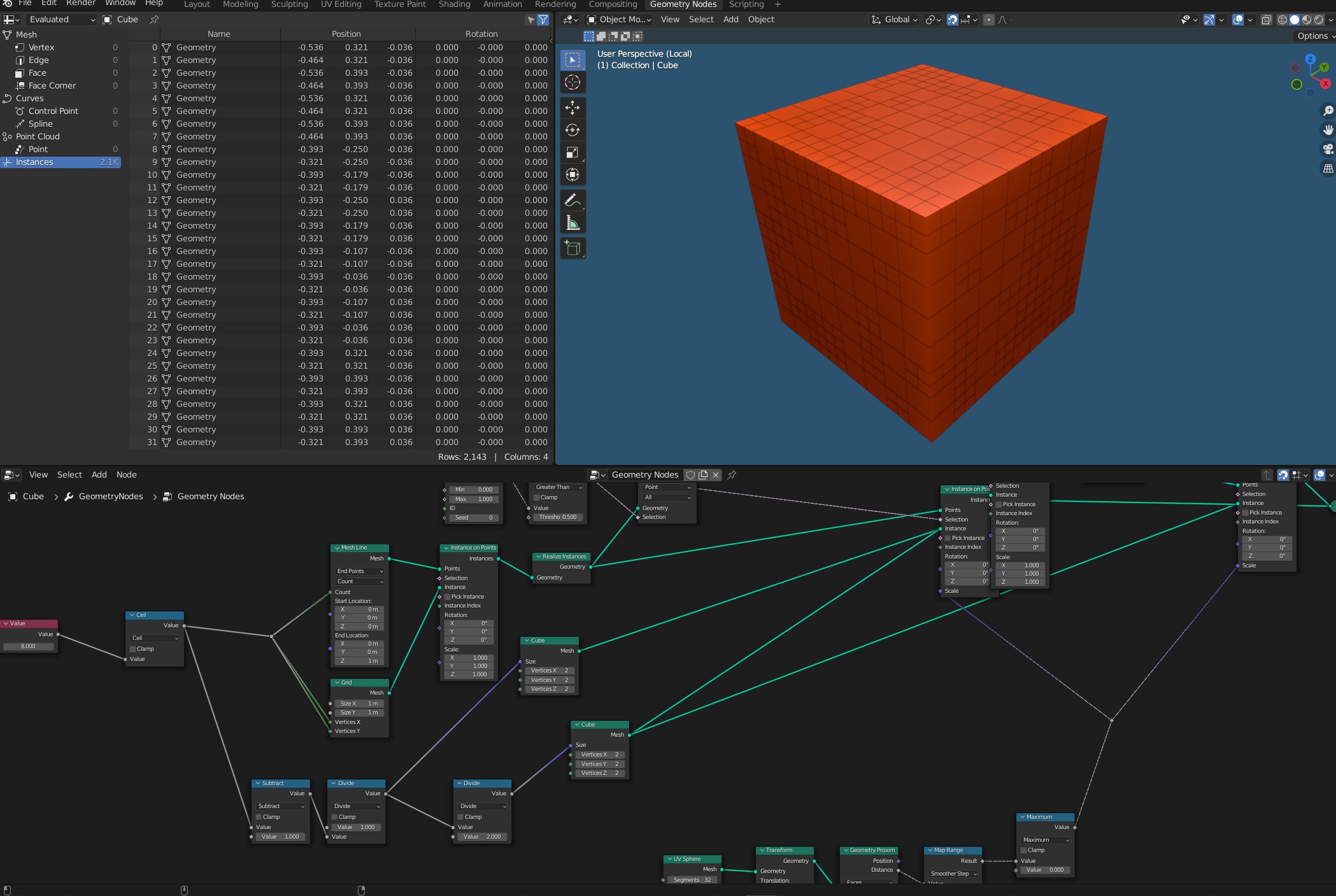 Experiments3D Art 155: Geometry Nodes Dissolving Cubes January 14, 2022 Updated: January 14, 2022 Process Links CUBES in CUBES with CUBES and a side of CUBES ← Previous post 154: Re-learning Blender 3.0 Geometry Nodes Next post → 156: Procedural Spiky Bomb with Geometry Nodes