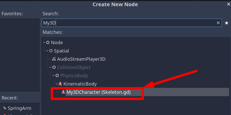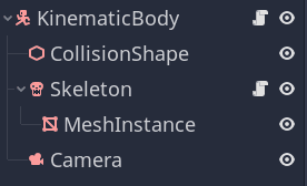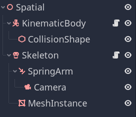 For that reason, for our Third Person Character example, we can arrange it with a Node of the type KinematicBody as the root and as a child all the other Nodes (or "Components"):