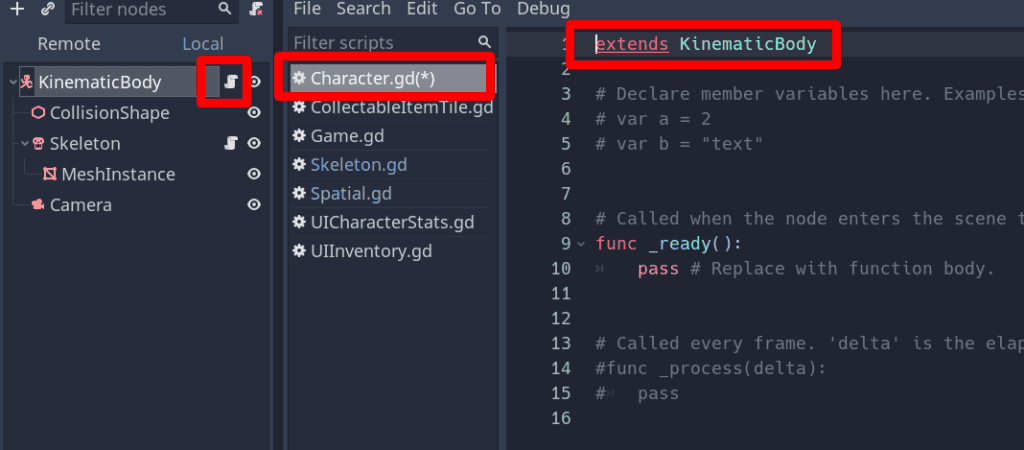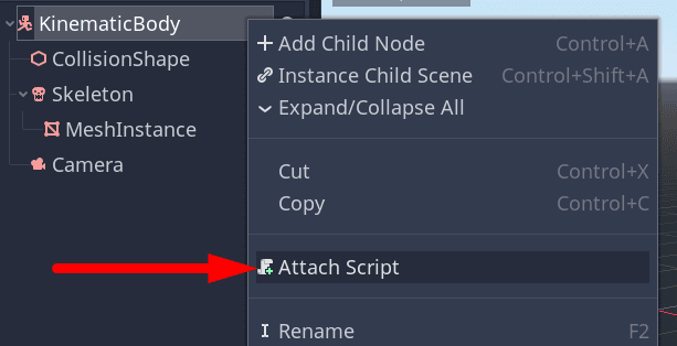 For example, by adding a script to a KinematicBody Node, you have all methods and properties available to make a character (or any other moving physics object).