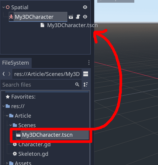 The scene is going to be added to the Node Tree as a Node itself. In the end, Scenes are a Tree of Nodes, being effectively a Node by itself – remember that in our 3D Character, we composed it with some Nodes, then saved it as a Scene