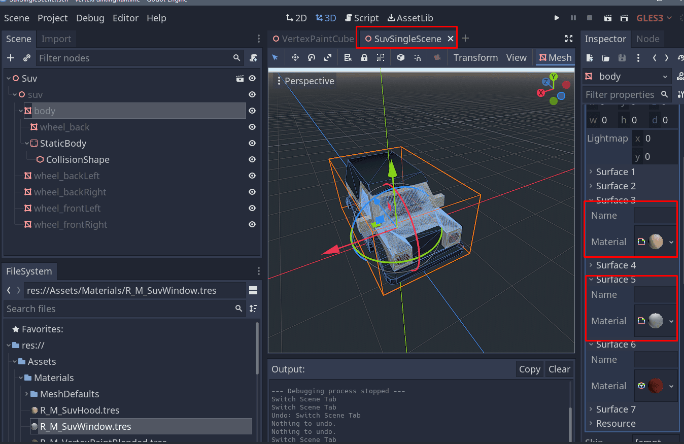 I went to another scene tab, then went back to the SuvSingleScene and tried to undo the material changes.