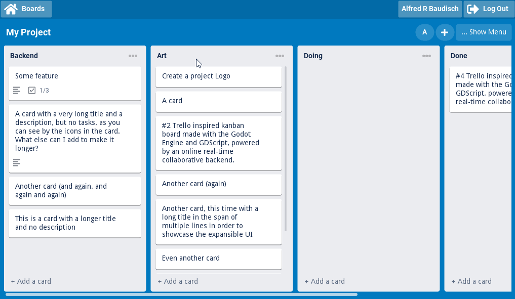 As a proof of concept, in 2020 I created a clone of the Trello interface with Godot – as of today, almost 3 years later, the repository was starred 599 times on GitHub, so it proved to be quite popular and something approved by the community.