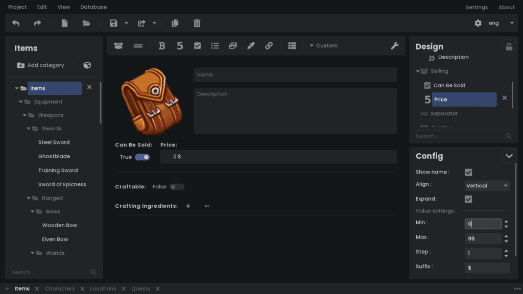 Use a powerful and intuitive editor with a drag-and-drop interface to design, edit and visualize content for your games, like items, quests, characters, and anything else your project needs. Then export to a text file or Unity's Scriptable Objects.