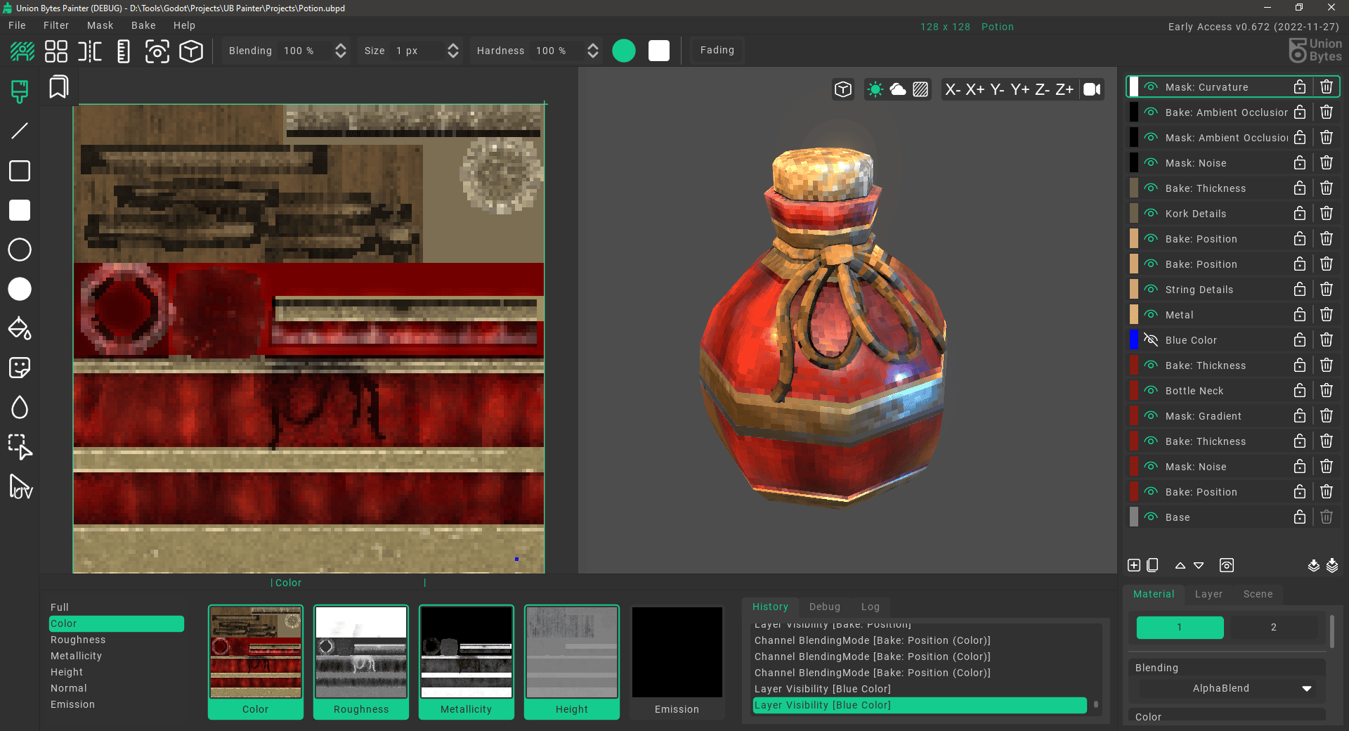 Union Bytes Painter allows the creation of 2D sprite and low res textures with color, normal, height, roughness, and metallic maps. Sprites and textures can be edited using multi-channel mode in the 2D or 3D space. It is similar to common applications such as Substance Painter. Basically, it's a cheap Adobe Substance Painter alternative (around US$ 13), but focused on retro looking textures.