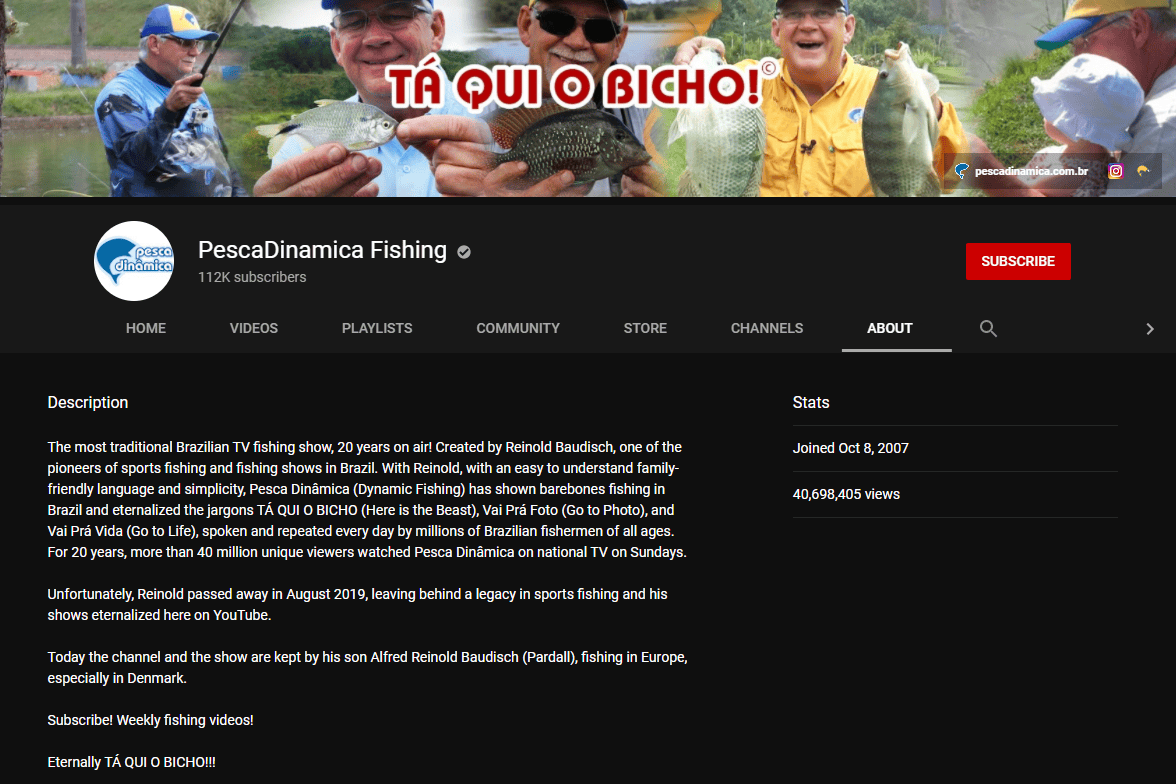 My father, Reinold Baudisch, was one of the most famous and important anglers in Brazil. For more than 40 years he founded different projects, all related to fishing: stores, newspapers, magazines, radio talk show, courses, books and a TV fishing show (his memorial/museum website is coming soon).