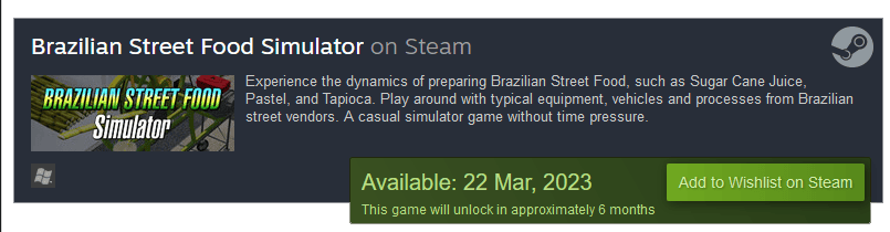 Experience the dynamics of preparing Brazilian Street Food, such as Sugar Cane Juice, Pastel, and Tapioca. Play around with typical equipment, vehicles and processes from Brazilian street vendors. A casual simulator game without time pressure (Steam Page).