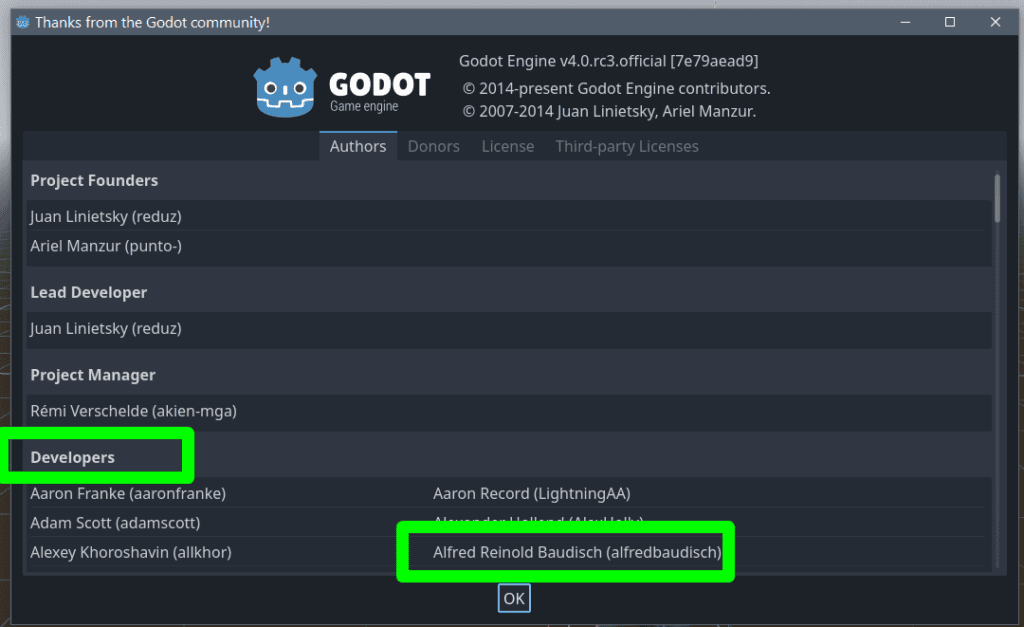 After reaching 10 contributions, I'm now added as an "official" Developer in the About section (I'm quoting "official", because technically as soon as you make a single contribution you are already a Godot Developer and Contributor):