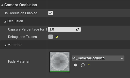 Since it inherits from our custom Player Controller, the Blueprint now has a section called "Camera Occlusion", where you have to configure the material to be used (plus some other parameters from our custom C++ class):